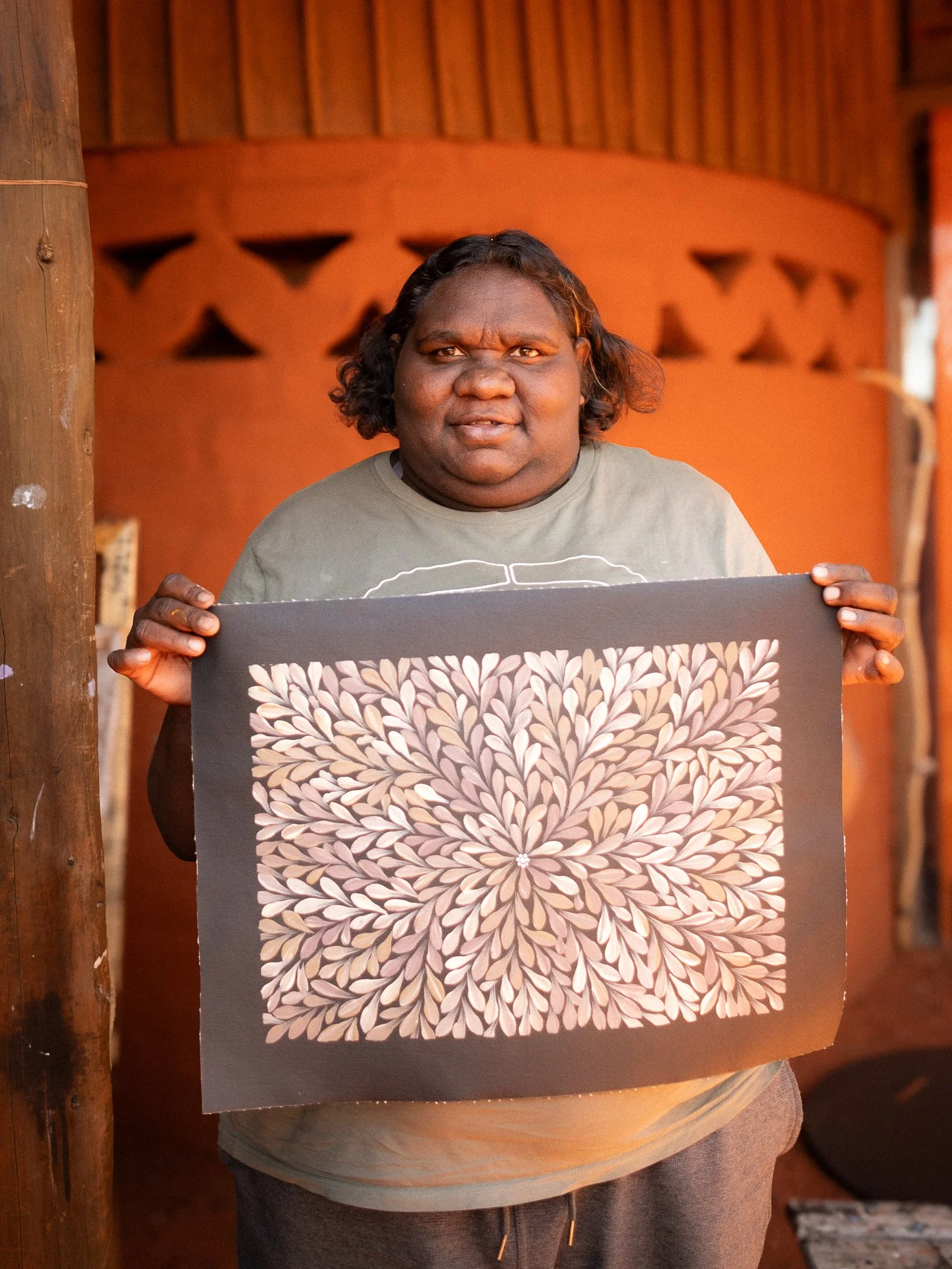 Local artist Olivia Moneymoon with her painting of Irmangka Irmangka, a bush medicine whose tiny leaves have carried Anangu healing for generations. Her work is culture, memory, and medicine on canvas. I was lucky to have had the chance to take this piece of art home with me.