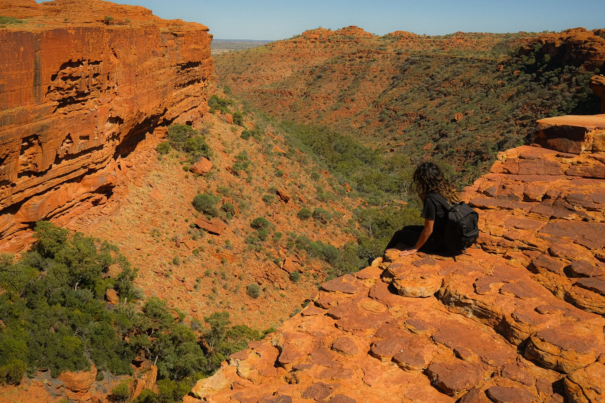 If you keep driving North of Uluru, you’ll eventually make it to King’s Canyon. It offers one of the most dramatic landscapes of the entire Stuart Highway trip — towering red rock walls, deep gorges, and views that hit you right in the chest. The Rim Walk is the star here. The first climb is a steep scramble straight up, but once you’re on the rim, the world opens into a maze of ancient sandstone, weathered domes, and plunging cliffs that glow bright orange in the sun.