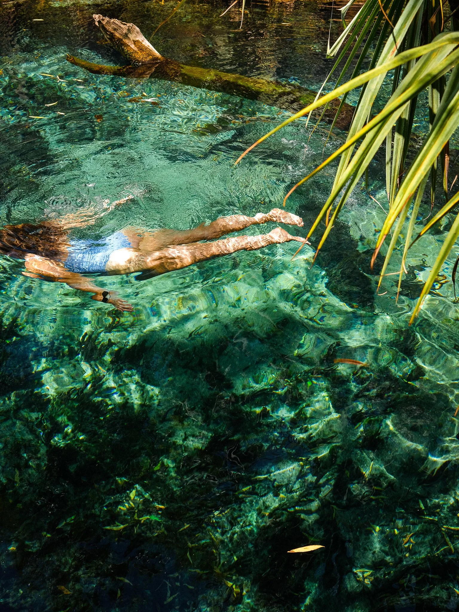 Bitter Springs feels like a sudden exhale after days in the outback — a hidden tropical pocket where everything suddenly transitions from dusty rusty musty orange to brilliant turquoise. It’s like a little pocket of tropical magic in the middle of the desert. Tucked just outside the tiny town of Mataranka, these natural thermal springs wind through tall palms and pandanus, creating a lovely float. You hop in at the beginning and swim or float down the bath-warm crystal clear blue water. It’s really quite magical, even amidst the lowkey underlying anxiety that possibly just maybe there could be a crocodile floating alongside you — just don’t think about that. Yes, you heard me, theoretically there could be crocs in the water. But don’t worry, they’re only “freshies” (fresh water crocs) not “salties” (salt water crocs) so they wouldn’t do that much damage anyway… (just me adopting the traditional Aussie mindset about crocs).