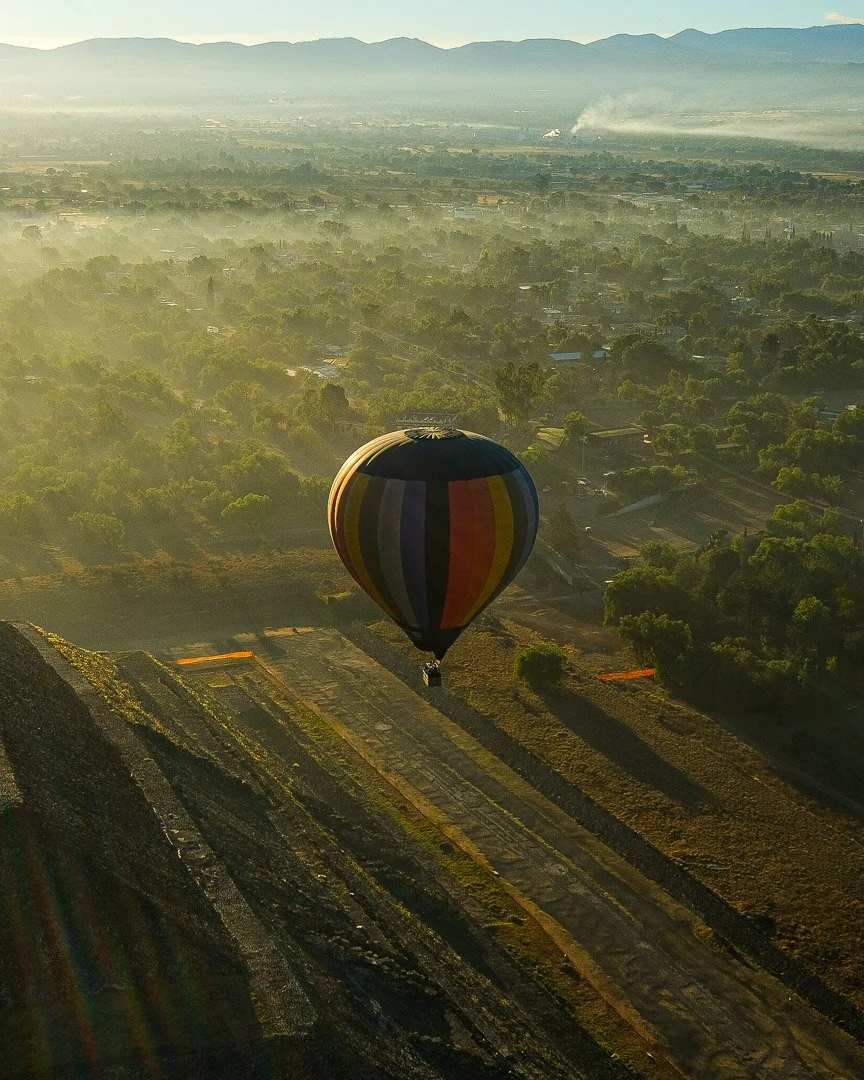 We visited the ancient city of Teotihuacán—“the place where the gods were created”—in the dreamiest of ways: sunrise sky sailing. Surrendering to the laws of thermodynamics, we lifted up in our hot air balloon, peering over the edges of our basket as the earth below grew farther and farther away. Amidst a throng of other colorfully patterned balloons, we floated over the the Temple of Quetzalcoatl and the Pyramids of the Sun and the Moon. The sun began to rush across the sky and envelop the world in golden morning light—the perfect sky for soaring above ancient wonders.